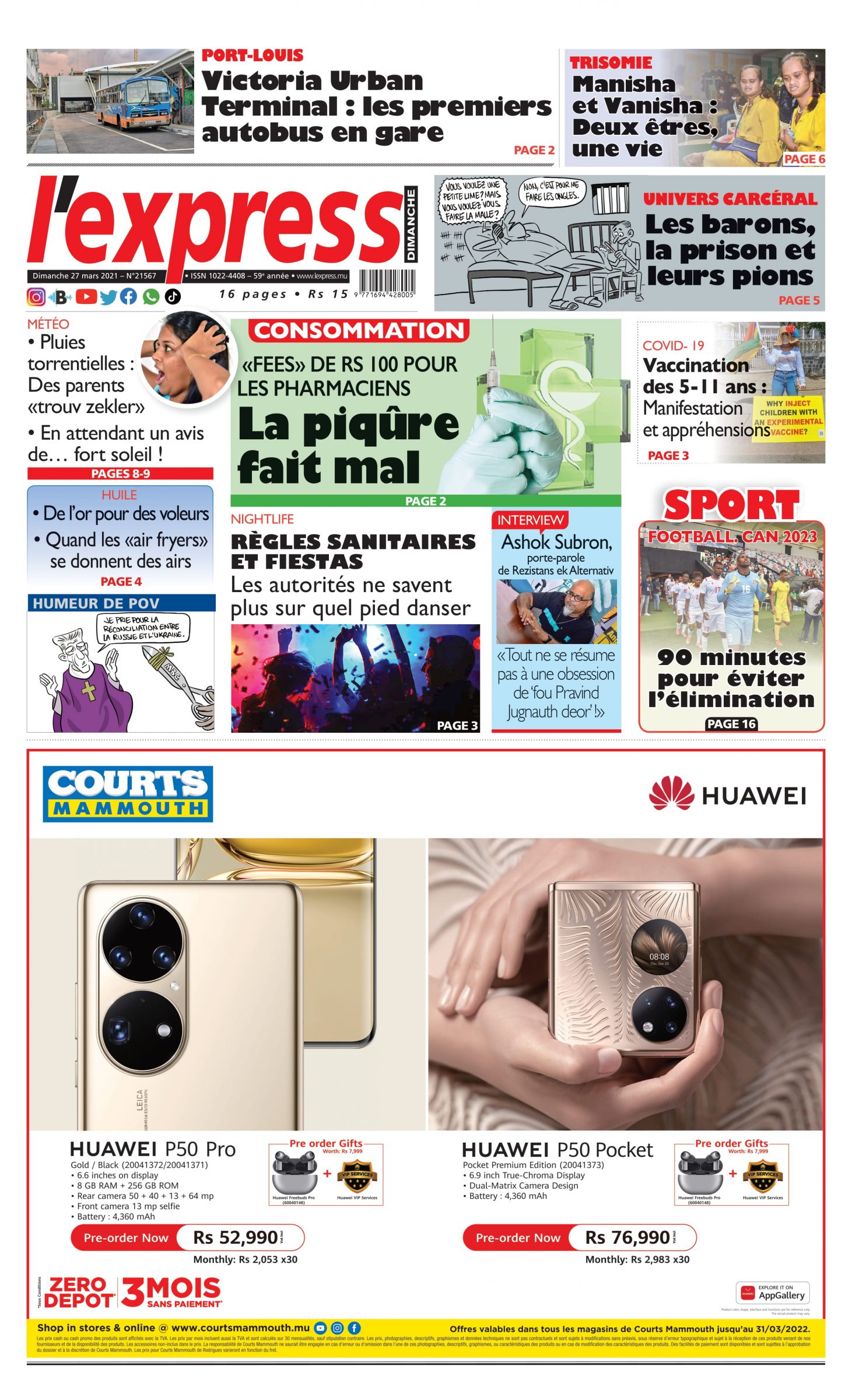 En une de l'express; Consommation: «fees» de Rs 100 pour les pharmaciens la piqûre fait mal; Autre titre; Règles sanitaires et fiestas: les autorités ne savent plus sur quel pied danser.