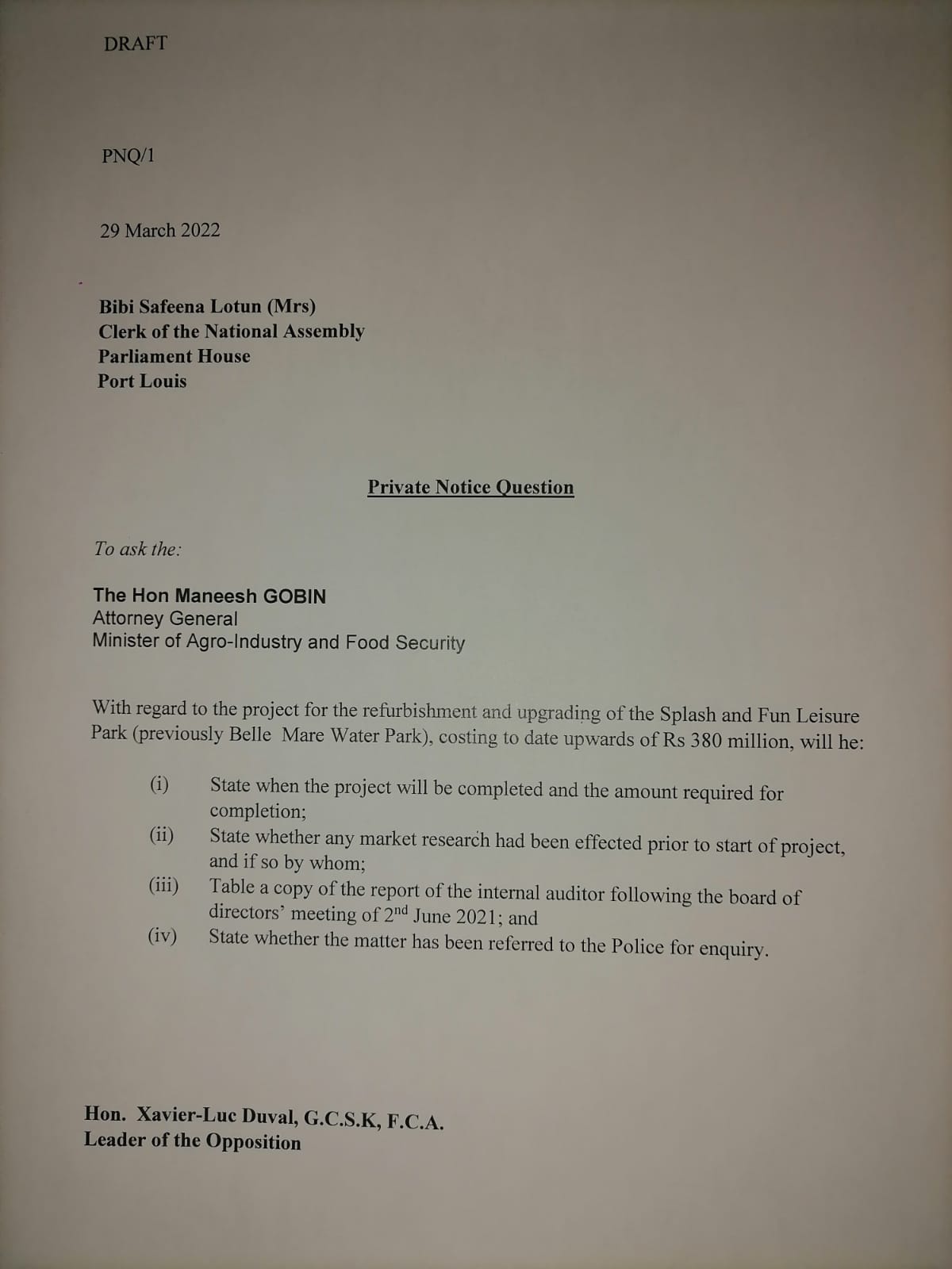 Pour la première Private Notice Question de la rentrée parlementaire ce mardi 29 mars, Xavier Duval interrogera Maneesh Gobin, le ministre de l’Agro-industrie, sur le Splash & Fun Leisure Park. Le leader de l’opposition lui demandera quand est-ce que les travaux prendront fin, les études de marché, les conclusions d’un rapport d’audit interne et si une enquête a été initiée.