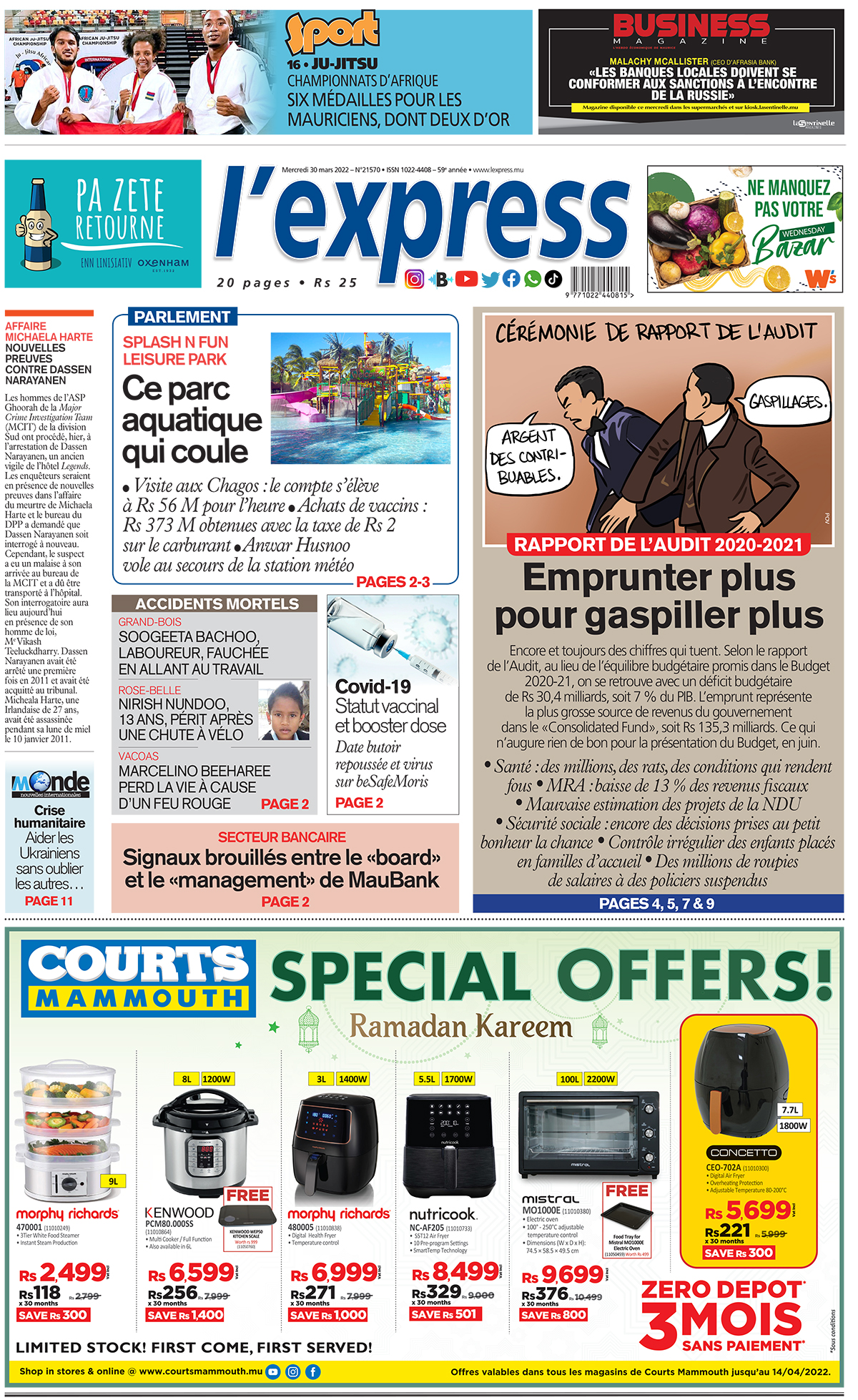 En une de l'express: Rapport de l’Audit 2020-2021 : Emprunter plus pour gaspiller plus ; Autre titre: Splash N Fun Leisure Park Ce parc aquatique qui coule.