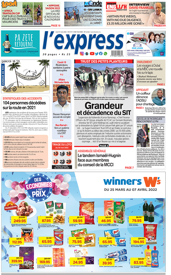 En une de l'express: Trust des petits planteurs: Grandeur et décadence du SIT ; Autre titre: Covid-19: restrictions sanitaires à peine assouplies