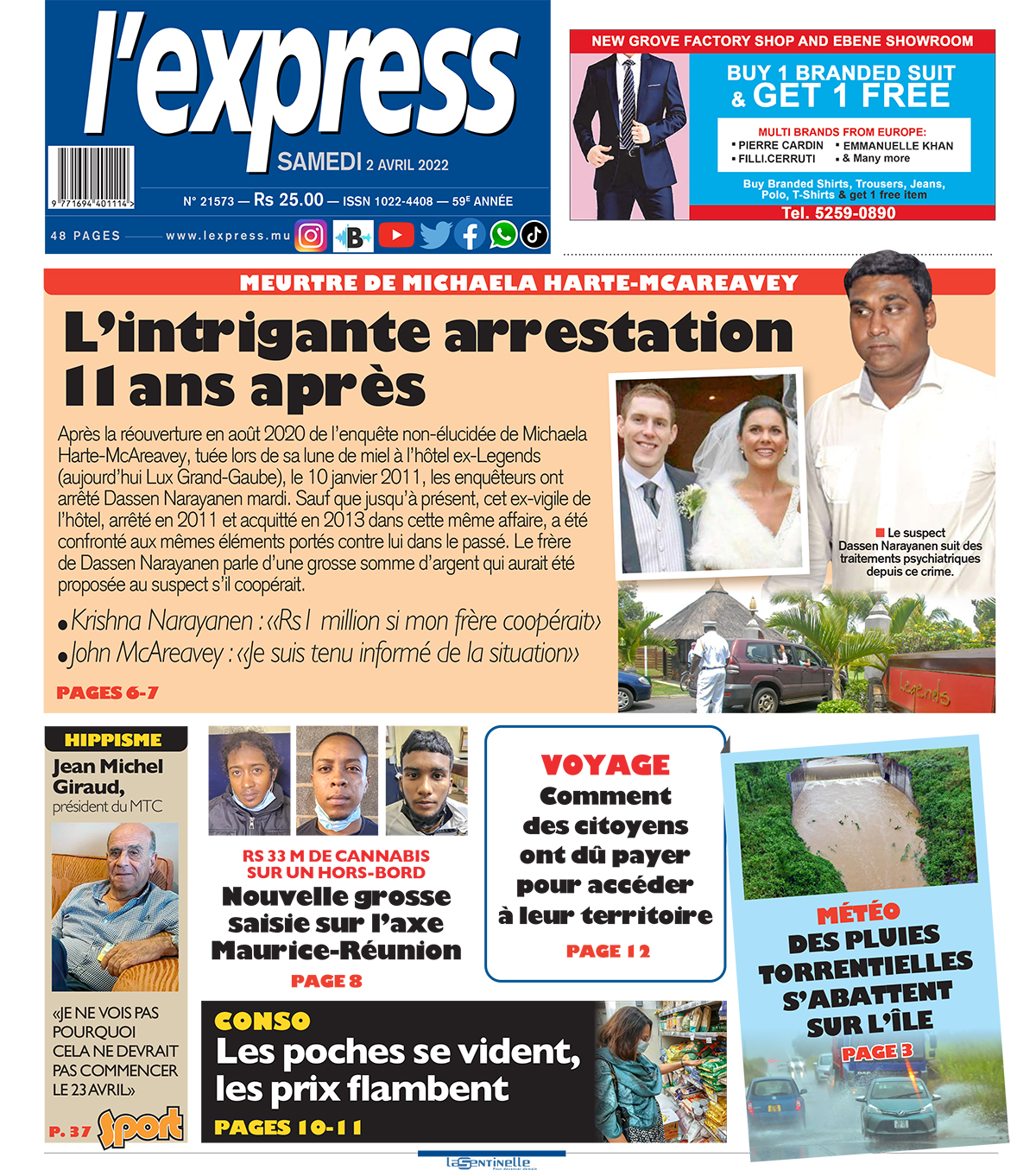 En une de l'express: Meurtre de Michaela Harte-Mcareavey : L’intrigante arrestation 11 ans après ; Autre titre: Rs 33 M de cannabis sur un hors-bord : Nouvelle grosse saisie sur l’axe Maurice-Réunion.