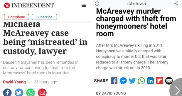 Sollicité pour un commentaire après la nouvelle arrestation de Dassen Narayanen, l’avocat mauricien de la famille Harte/McAreavey, Me Dick Ng Sui Wa, a déclaré laisser la police faire son travail. «Il est trop tôt pour tirer des conclusions.» Les Harte ont appris la nouvelle de l’arrestation de l’ancien vigile de l’ex-hôtel Legends à travers la presse étrangère et ils ont aussitôt contacté Me Ng Sui Wa. Cependant, les proches de la défunte en Irlande ne veulent pas interférer avec l’enquête policière.