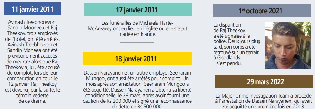 Selon des recoupements d’informations, les enquêteurs soupçonnent que Dassen Narayanen aurait volé la carte magnétique pour la remettre à l’un des protagonistes déjà arrêtés dans l’affaire. Sauf qu’en 2011, l’ancien vigile avait déjà expliqué qu’il avait remis la carte magnétique aux valets de chambre pour le nettoyage. Quant à la serviette, Dassen Narayanen avait affirmé avoir entendu des appels au secours provenant de la chambre du couple et qu’il s’y était rendu et avait remis la serviette à John McAreavey lorsqu’il a découvert le corps inerte de son épouse dans la baignoire. Il s’est expliqué par rapport aux nouvelles preuves que détiennent les enquêteurs de la MCIT. Le suspect sera à nouveau traduit en cour le mardi 5 avril.