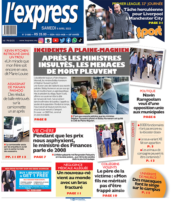 En une de l'express: Incidents à Plaine-Magnien: après les ministres insultés, les menaces de mort pleuvent ; Autre titre: Politique: Navin Ramgoolam veut d’une opposition unie aux municipales