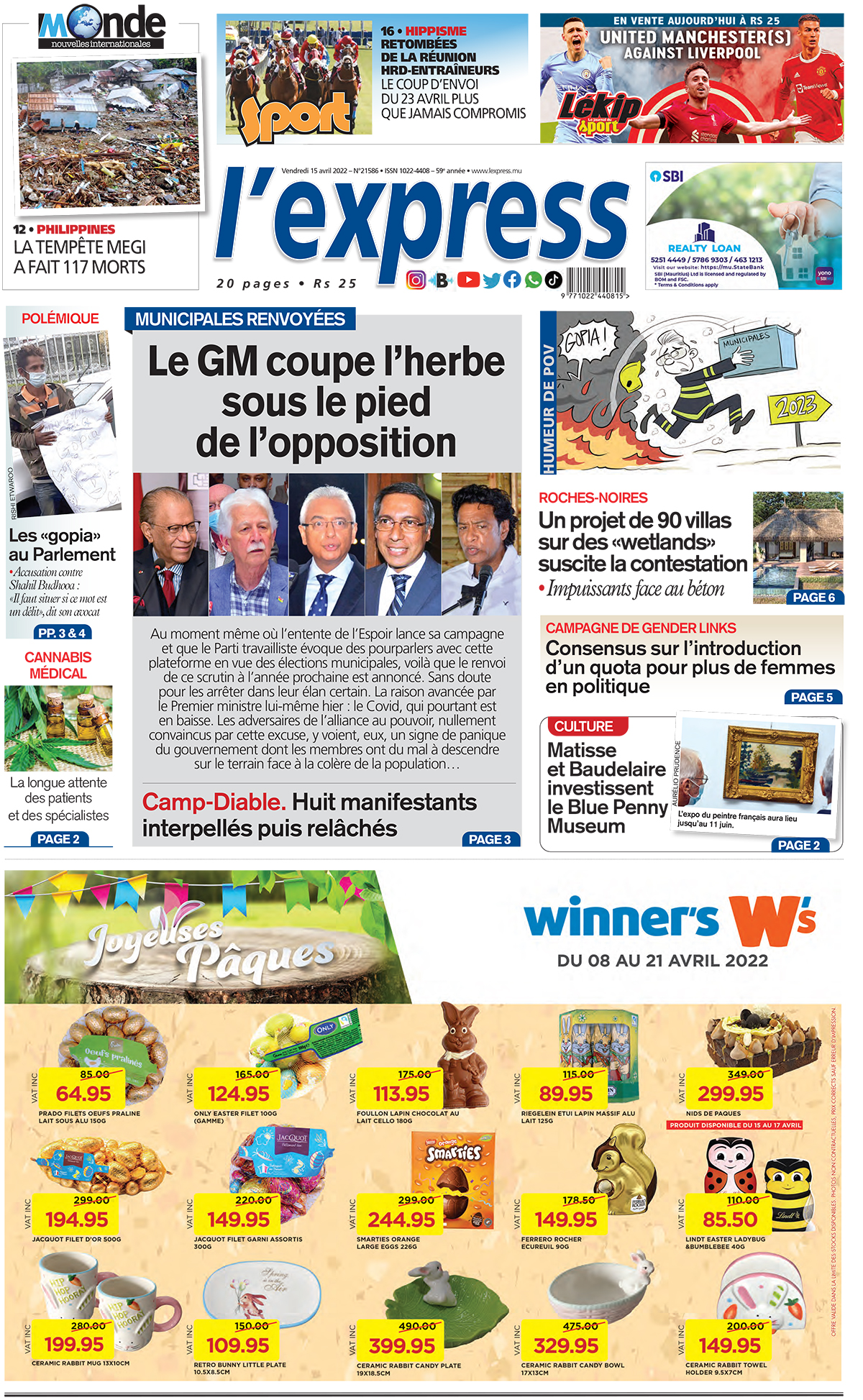 En une de l'express: Municipales renvoyées : Le GM coupe l’herbe sous le pied de l’opposition ; Autre titre: Roches-Noires : Un projet de 90 villas sur des «wetlands» suscite la contestation.