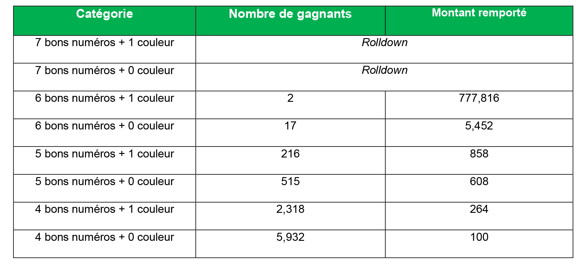 2 joueurs remportent le jackpot pour ce 72e tirage de la Loterie Vert en cochant que 6 bons numéros et la bonne couleur. Ainsi ils empochent Rs 777,816 chacun.