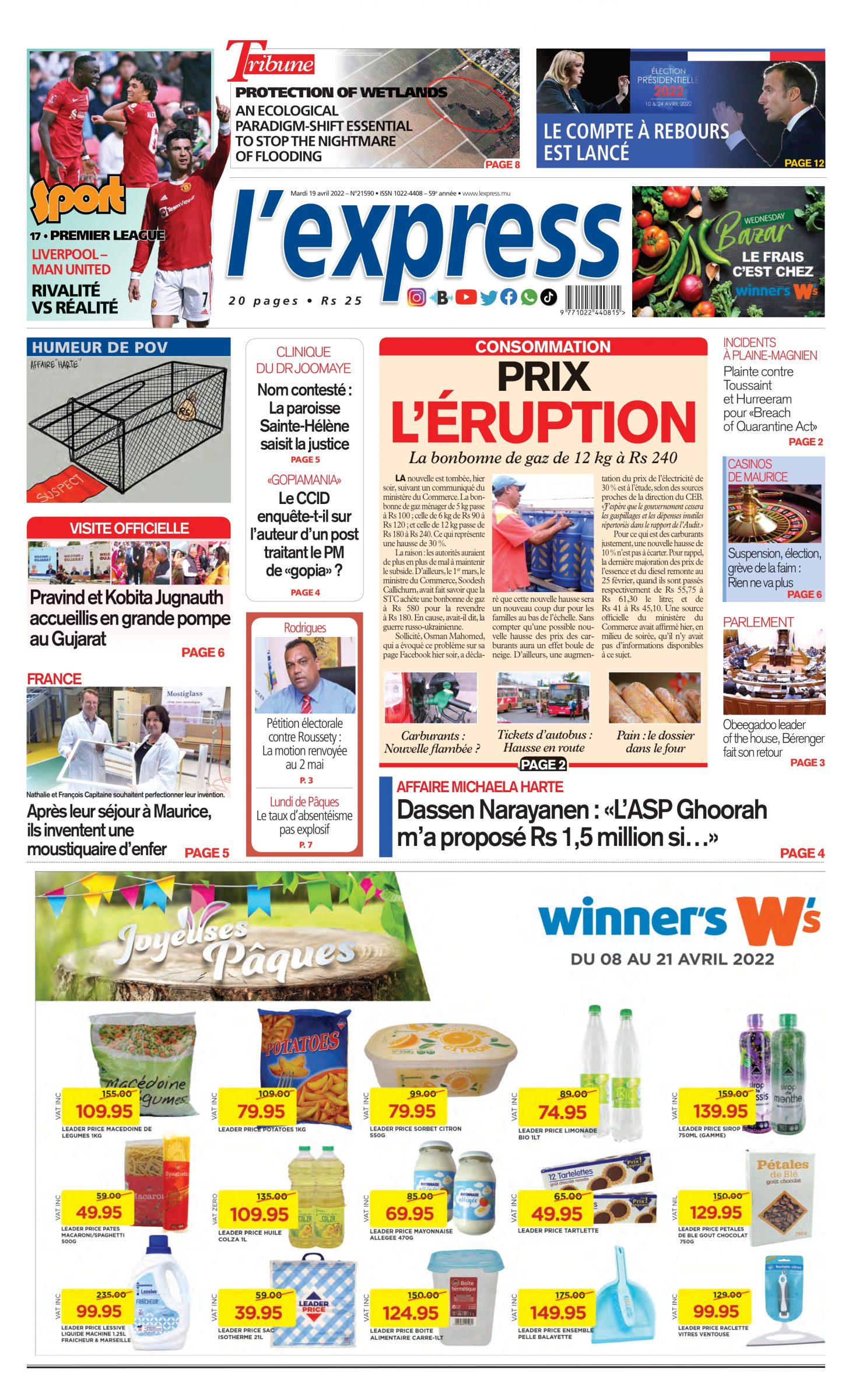 En une de l'express;Prix | l’éruption: La bonbonne de gaz de 12 kg à Rs 240; Autre titre: Pravind et Kobita Jugnauth accueillis en grande pompe au Gujarat.