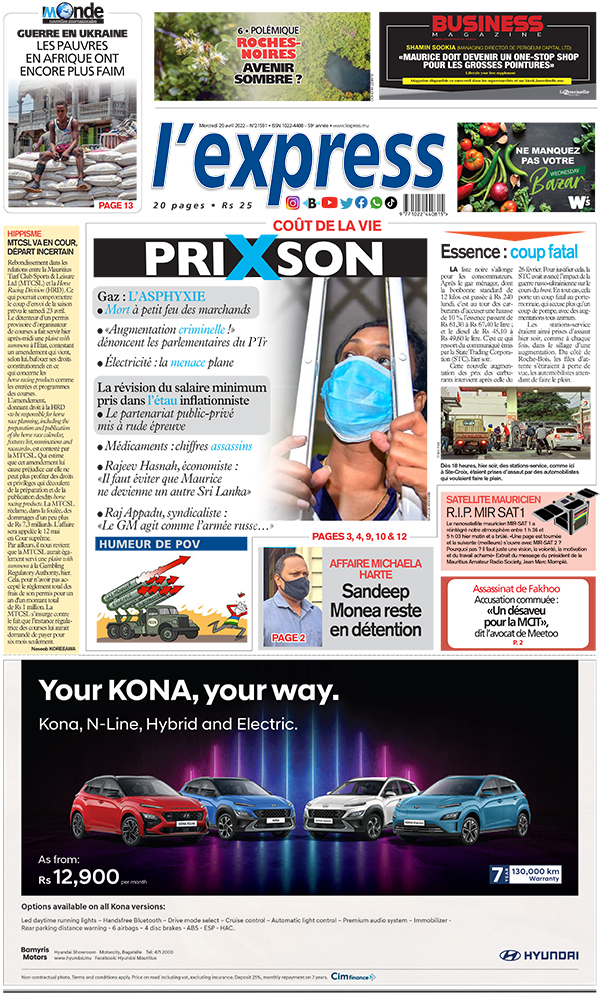 En une de l'express: Coût de la vie: prixson ; Autre titre: Affaire Michaela Harte: Sandeep Monea reste en détention