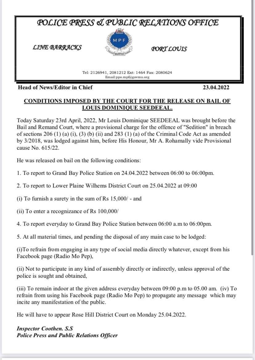 Consciente de la gravité de la situation dans le pays, la police s’est livrée à un exercice de relations publiques en publiant les conditions attachées à la remise en liberté de l’activiste Darren.