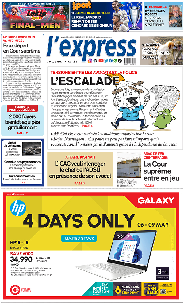 En une de l'express: Tensions entre les avocats et la police: l’escalade ; Autre titre: Affaire Kistnah: l’ICAC veut interroger le chef de l’ADSU en présence de son avocat