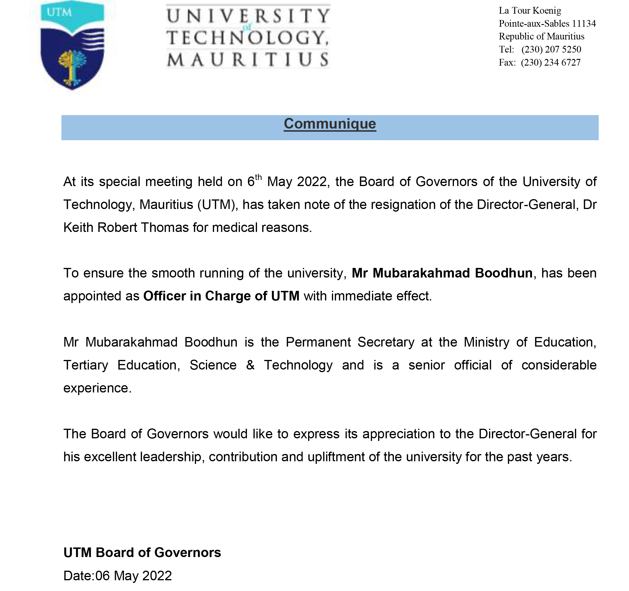 Dr Keith Robert Thomas, directeur de l’University of Technology (UTM), a démissionné pour des raisons médicales. C’est ce qui ressort d’un communiqué émis par l’établissement émis ce vendredi 6 mai. Mr Mubarakahmad Boodhun, secrétaire permanent au ministère de l’Education, a été nommé Officer in Charge.