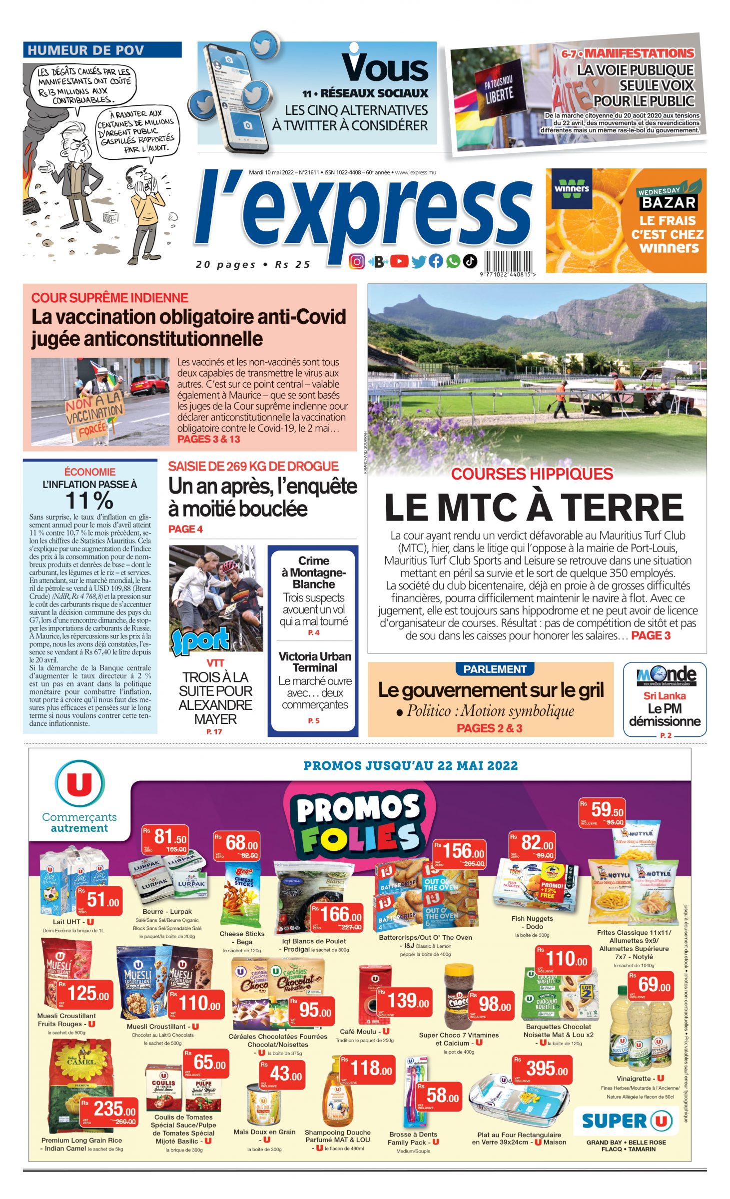 En une de l'express; Courses hippiques: Le MTC à terre; Autre titre; Économie: l’inflation passe à 11%.
