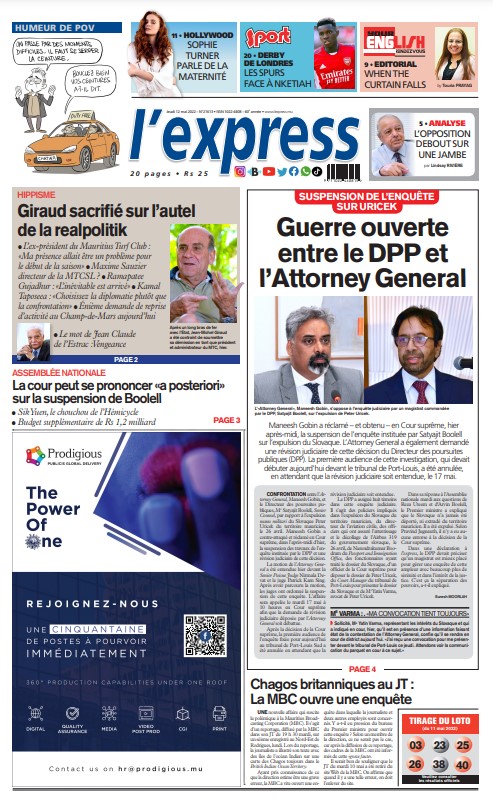 En une de l'express: Suspension de l’enquête sur Uricek: Guerre ouverte entre le DPP et l’Attorney General ; Autre titre: Hippisme: Giraud sacrifié sur l’autel de la realpolitik