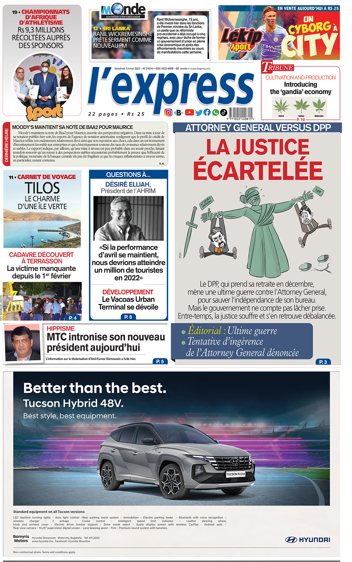 En une de l'express: Attorney General versus DPP : La justice écartelée; Autre titre: Cadavre découvert à Terrasson : La victime manquante depuis le 1er février.