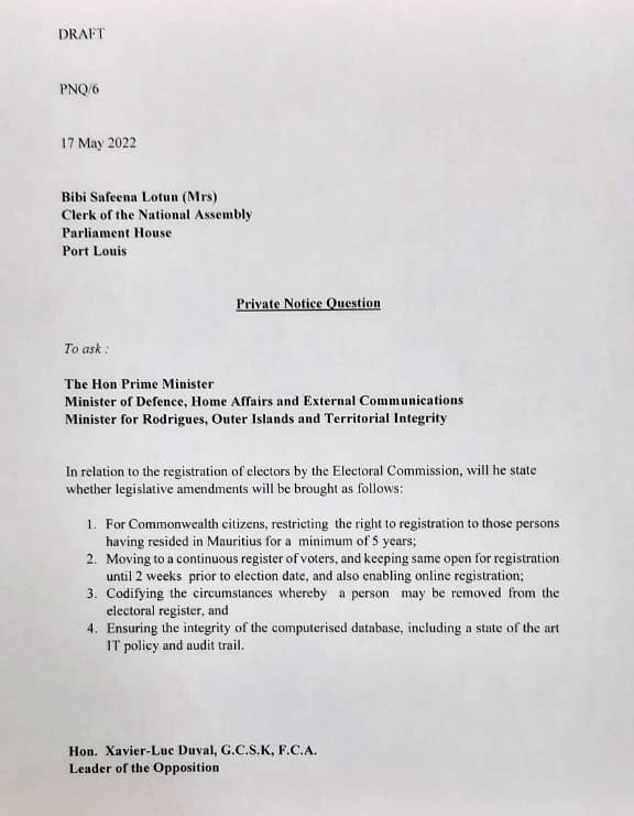 Ci-dessous la PNQ, qui sera posée à Pravind Jugnauth à 11 h 30 :