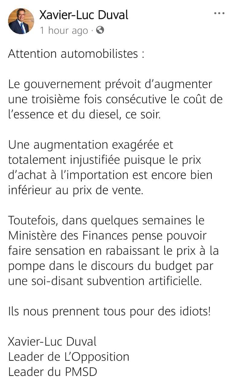 Il l’a dit deux fois à l’Assemblée Nationale la semaine dernière, et il renchérit. Le leader de l’opposition croit savoir que le prix des carburants à la pompe pourrait encore être revu à la hausse ce mercredi. Xavier-Luc Duval l’a écrit sur Facebook tôt ce matin.
