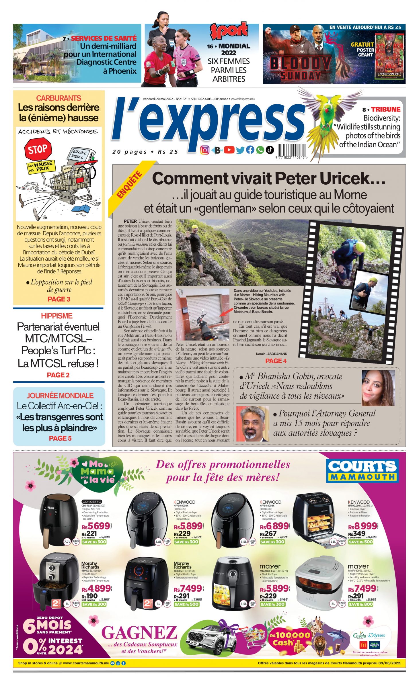 En une de l'express de ce vendredi 20 mai; Comment vivait Peter Uricek… …il jouait au guide touristique au Morne et était un «gentleman» selon ceux qui le côtoyaient; Autre titre; Carburants: Les raisons derrière la (énième) hausse.