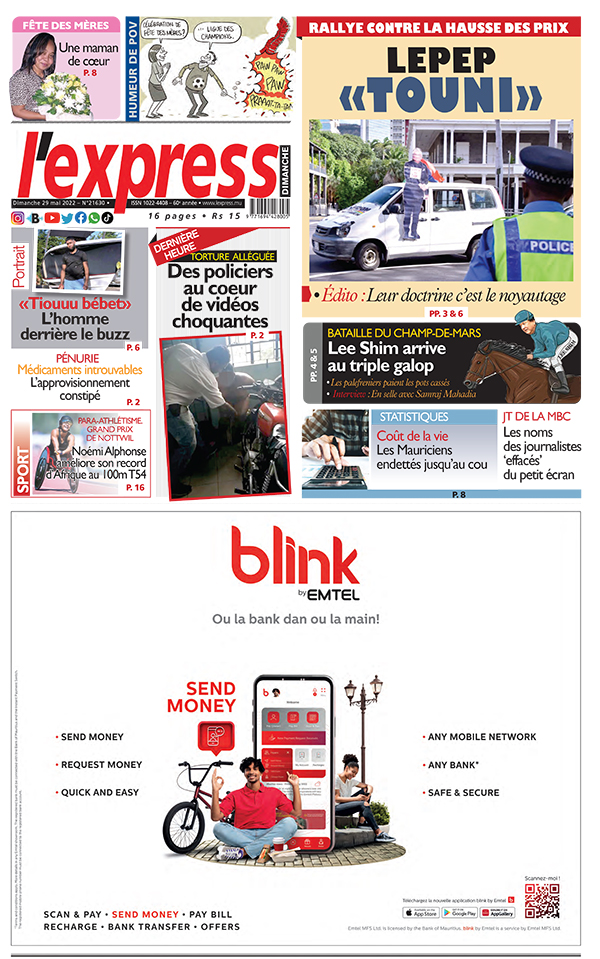 En une de l'express: Rallye contre la hausse des prix: lepep «Touni» ; Autre titre: Fête des mères: une maman de coeur