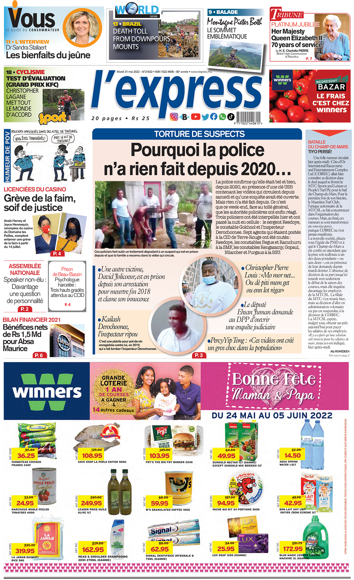 En une de l'express: Torture de suspects : Pourquoi la police n’a rien fait depuis 2020… ; Autre titre: Licenciées du casino : Grève de la faim, soif de justice.
