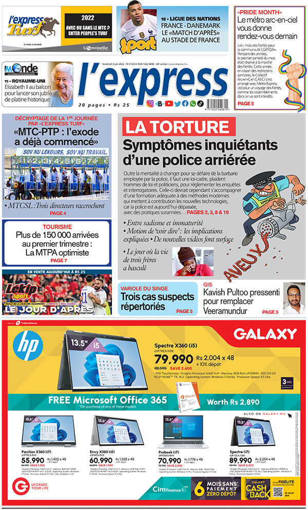 En une de l'express: La torture: symptômes inquiétants d’une police arriérée ; Autre titre: Variole du singe: trois cas suspects répertoriés