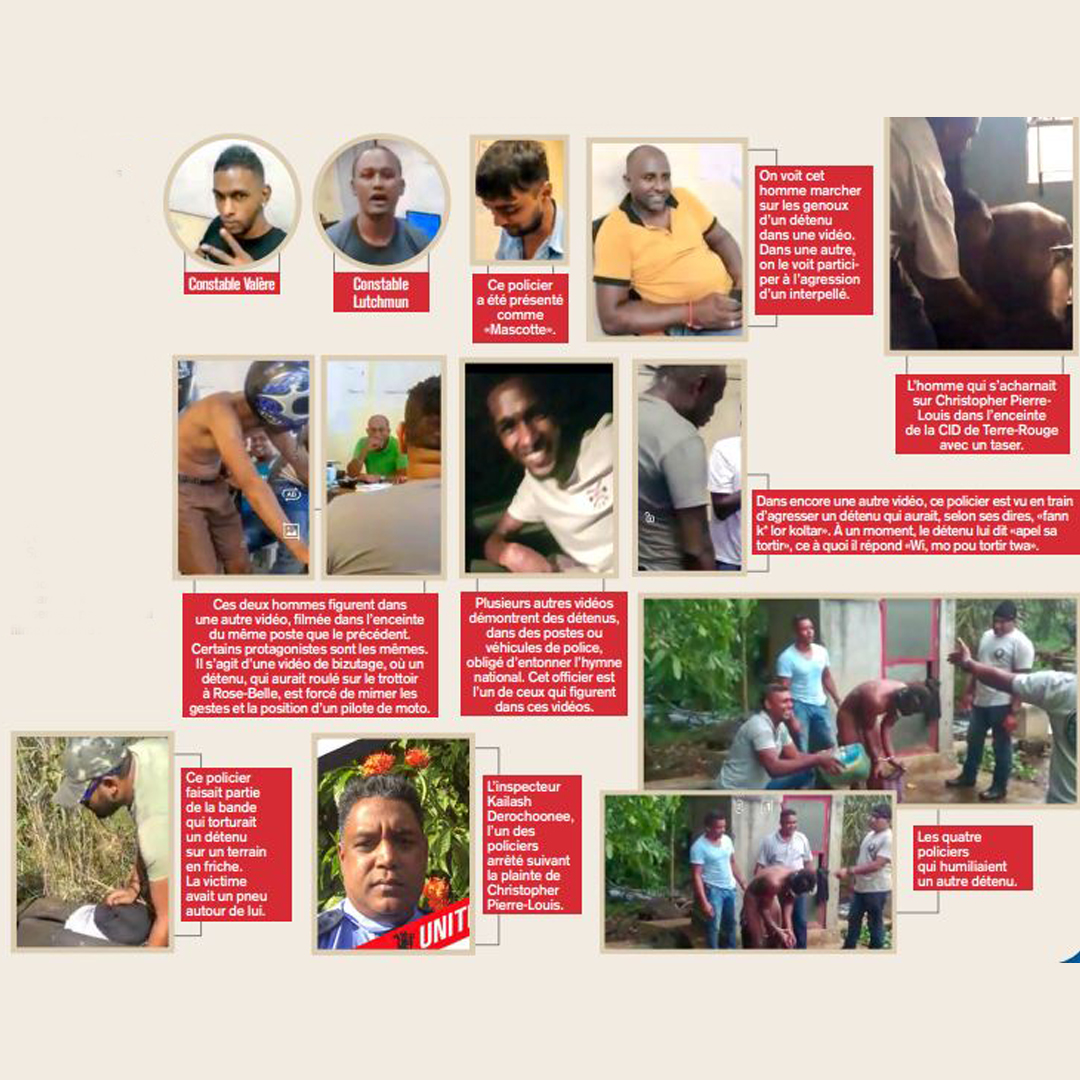 Les nouvelles vidéos de détenus dans des postes de police révèlent non seulement un peu plus sur les méthodes de torture physiques et psychologiques utilisées par des policiers, mais aussi l’identité de ces derniers. Dans l’une d’elles, des policiers jouent au carrom pendant qu’un détenu assis par terre se fait marcher dessus. Ils se présentent avec leur nom ou surnom. Les vidéos concernent plusieurs unités de la police, à l’instar de la Central Investigation Division de Mahébourg, l’Anti-Robbery Squad ou, encore, la Special Cell. Dans la vidéo où les policiers jouent au carrom, ils sont présentés, par celui qui filme, comme.