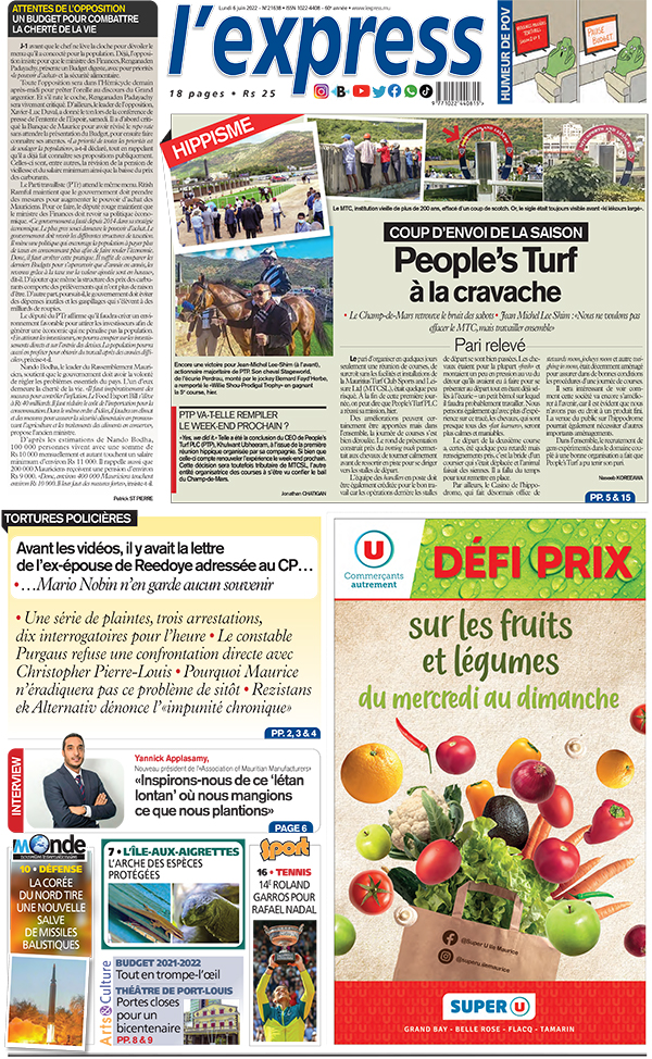 En une de l'express: Coup d’envoi de la saison: People’s Turf à la cravache ; Autre titre: Tortures policières: avant les vidéos, il y avait la lettre de l’ex-épouse de Reedoye adressée au CP…