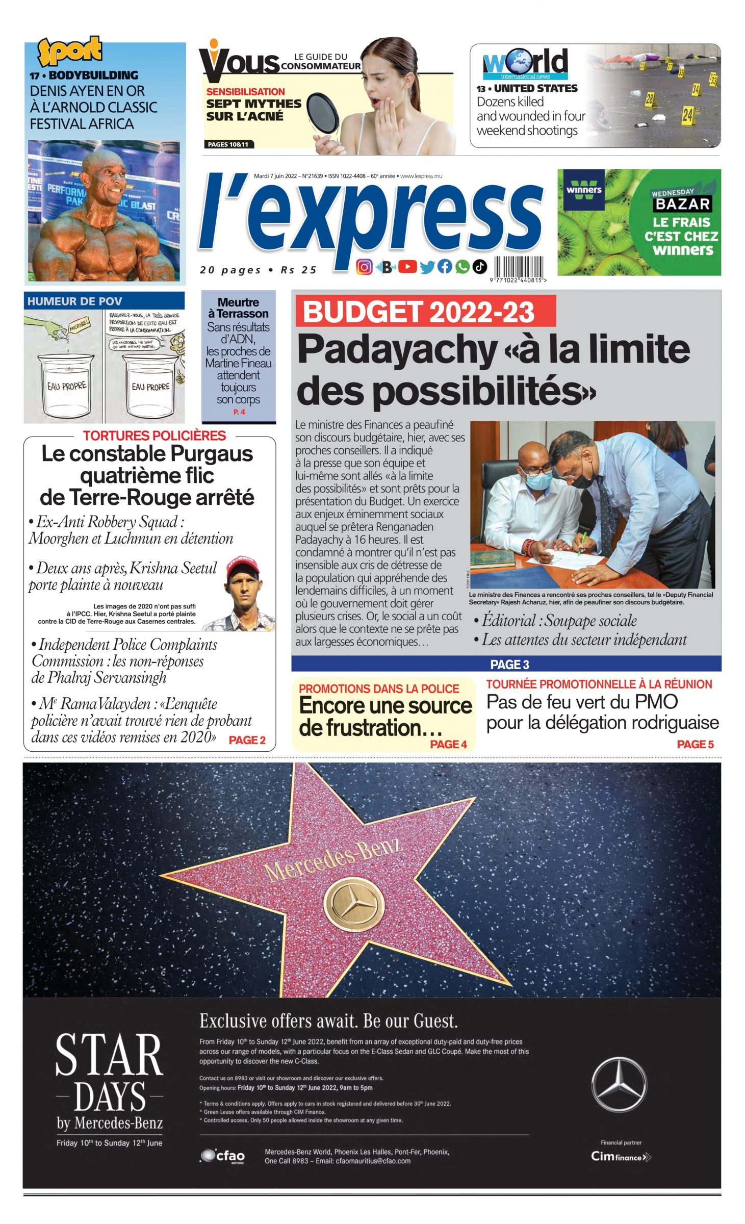En une de l'express;Budget 2022-23:Padayachy «à la limite des possibilités»; Autre titre; Le constable Purgaus quatrième flic de Terre-Rouge arrêté.