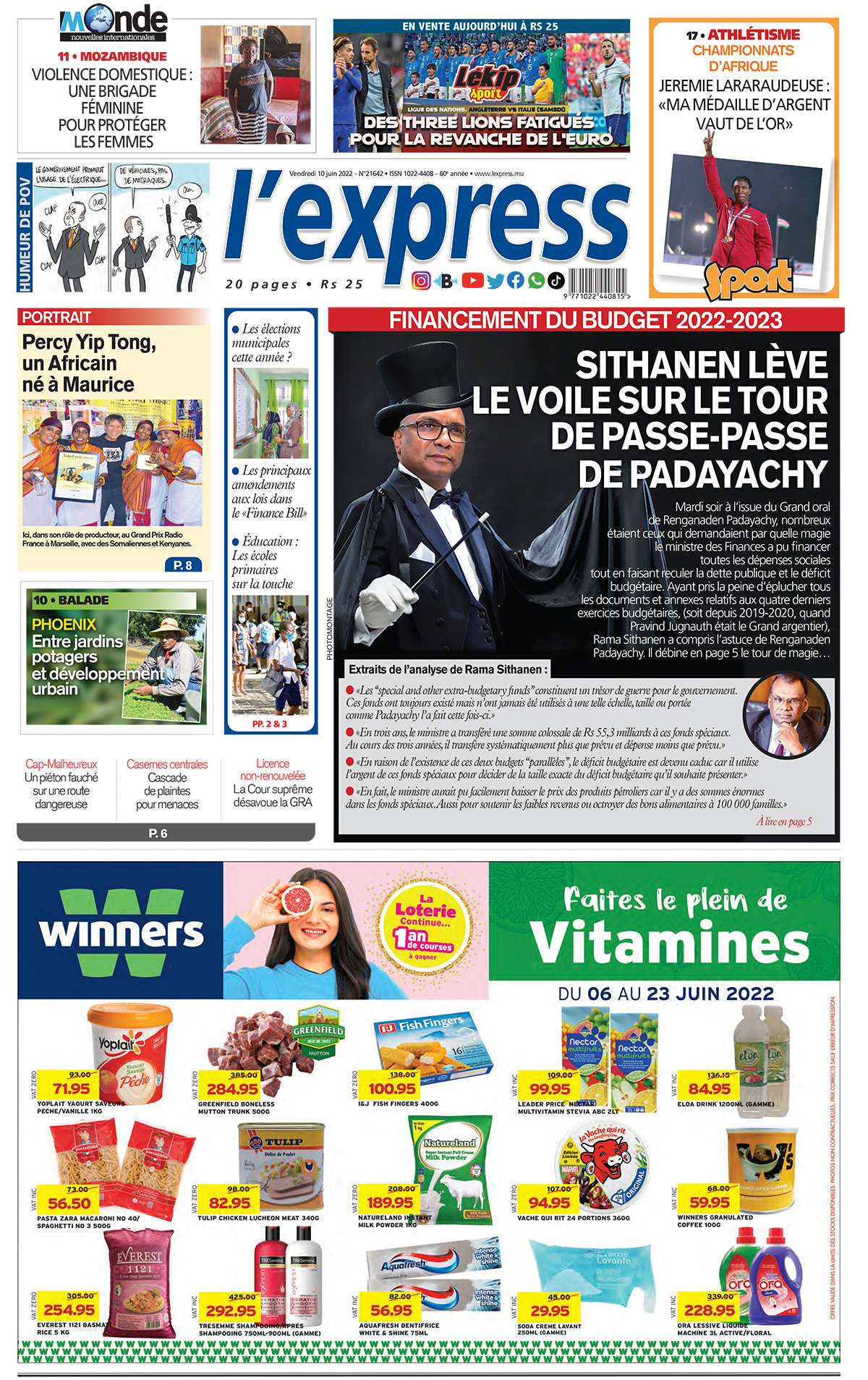 En une de l'express: Financement du budget 2022-2023 : Sithanen lève le voile sur le tour de passe-passe de Padayachy; Autre titre: Portrait : Percy Yip Tong, un Africain né à Maurice.