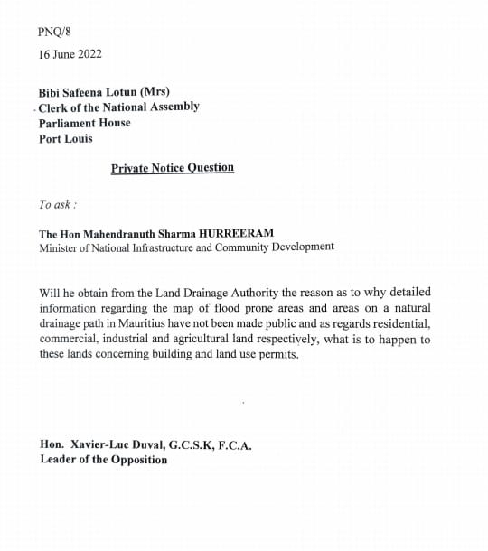 Les travaux parlementaires reprennent ce jeudi 16 juin avec la Private Notice Question (PNQ) sur les régions inondables lors des grosses pluies. Le Leader de l'opposition Xavier-Luc Duval adressera sa PNQ au ministre des Infrastructures nationales Bobby Hurreeram et lui demandera notamment pourquoi la Land Drainage Authority n'a pas rendu publique la carte des zones inondables mais surtout celle des drains naturels où des bâtiments commerciaux, résidentiels, industriels et autres ont poussé comme des champignons. Cela, dans bien des cas, avec un «Building and Land use permit» délivré par les autorités.