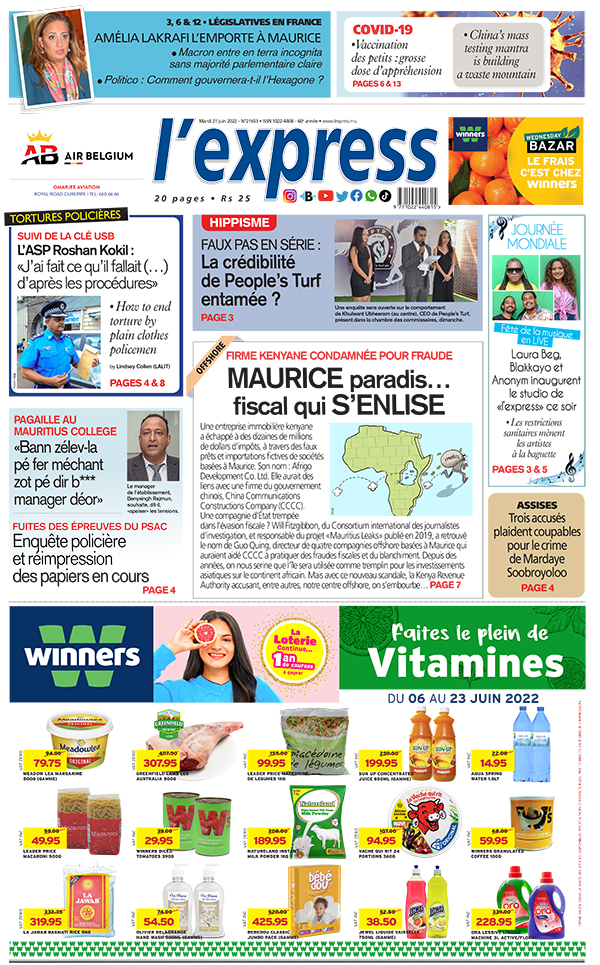 En une de l'express: Firme kenyane condamnée pour fraude: Maurice paradis… fiscal qui s’enlise ; Autre titre: Faux pas en série: la crédibilité de People’s Turf entamée ?
