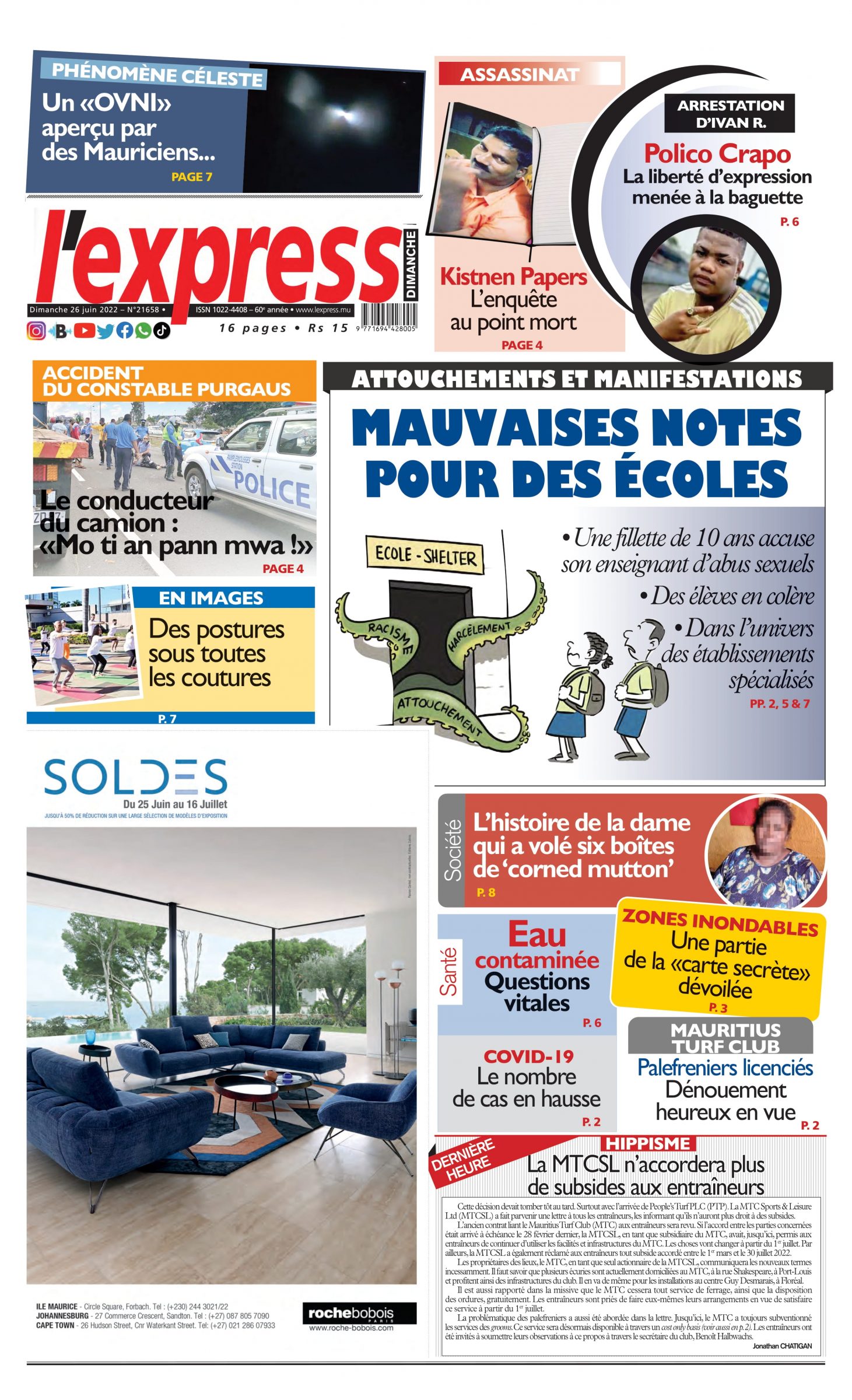 En une de l'express; Attouchements et manifestations: Mauvaises notes pour des écoles; Autre titre; L’histoire de la dame qui a volé six boîtes de ‘corned mutton’.