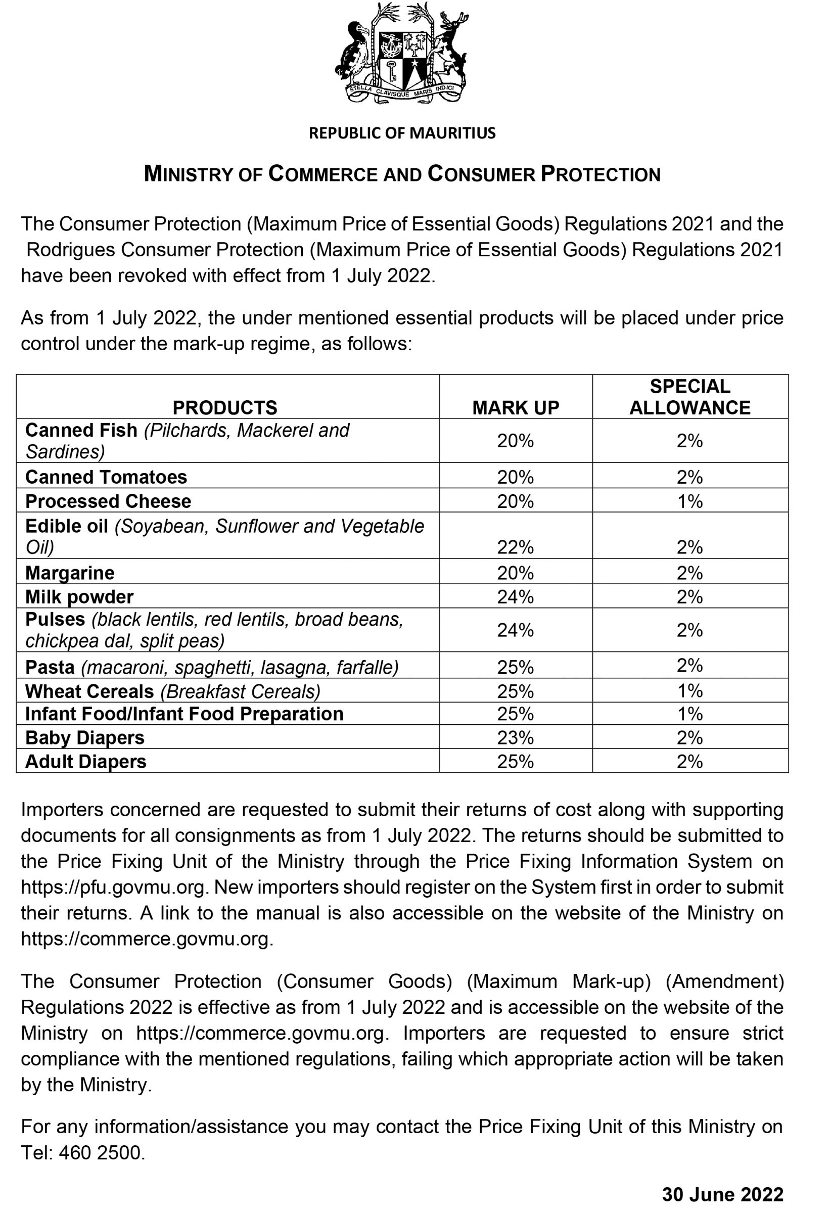 Votre porte-monnaie risque d’avoir encore plus froid en ce vendredi 1er juillet. Alors que sept produits de base ne seront plus subventionnés, le ministère du Commerce a émis un communiqué proposant le «mark-up», soit la marge de profits, que pourront imposer les importateurs/revendeurs, qui varie de 20 à 25 %. Par ailleurs, une allocation spéciale de 1 à 2 % est proposée. Les produits concernés sont les pilchards, les sardines, la tomate en conserve, l’huile, le fromage, le lait, la margarine, les grains secs, les céréales, les pâtes, la nourriture pour bébé et les couches.