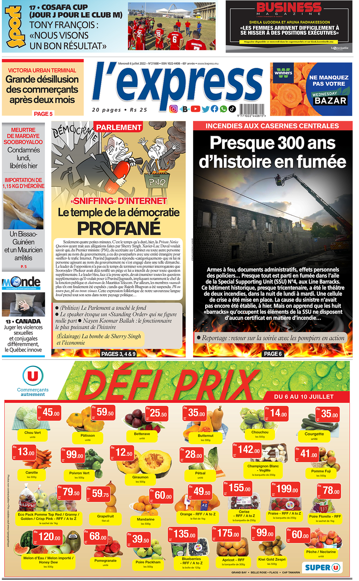 En une de l'express: «Sniffing» d’internet : Le temple de la démocratie profané; Autre titre: Incendies aux casernes centrales : Presque 300 ans d’histoire en fumée.