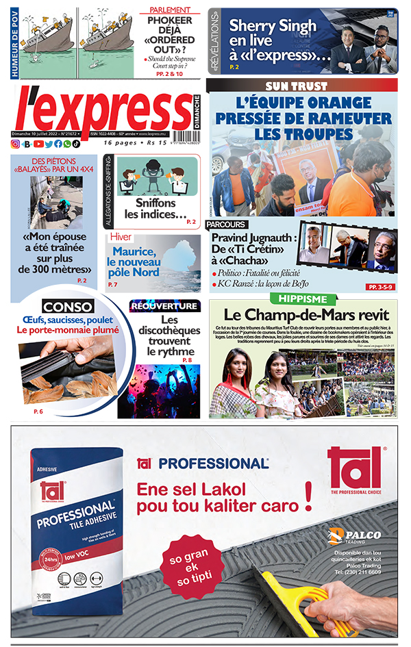 En une de l'express: Sun Trust: l’équipe orange pressée de rameuter les troupes ; Autre titre: Pravind Jugnauth: de «Ti Crétin» à «Chacha»