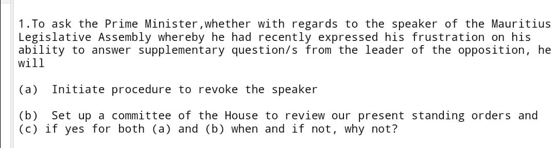 Le président du Parti travailliste voulait savoir du Premier ministre s'il allait enclencher les procédures pour révoquer le Speaker Sooroojdev Phokeer. Cela, après la frustration exprimée publiquement par Pravind Jugnauth, de n'avoir pu répondre aux questions supplémentaires du Leader de l'opposition Xavier-Luc Duval sur les accusations de Sherry Singh pour trafic allégué d'Internet, la semaine dernière.