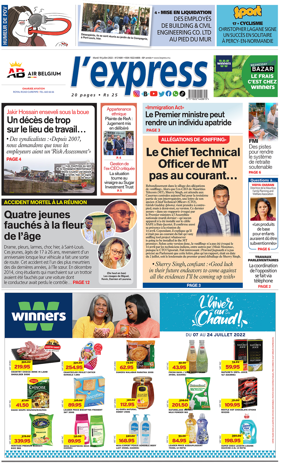 En une de l'express: Allégations de «sniffing» : Le Chief Technical Officer de MT pas au courant…; Autre titre: Accident mortel à La réunion : Quatre jeunes fauchés à la fleur de l’âge.