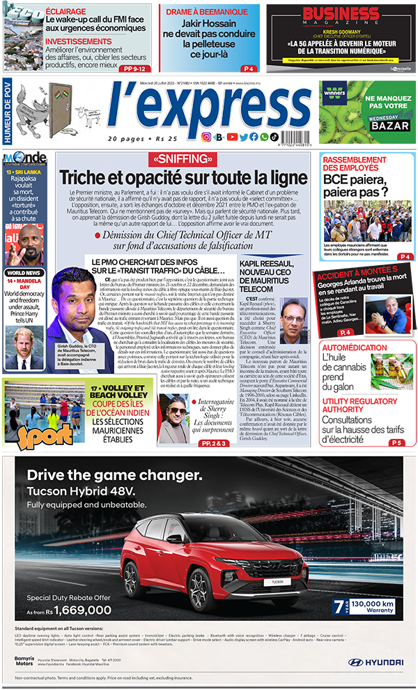 Le Premier ministre, au Parlement, a fui : il n’a pas voulu dire s’il avait informé le Cabinet d’un problème de sécurité nationale, il a affirmé qu’il n’y avait pas de rapport, il n’a pas voulu de «select committee»… L’opposition, ensuite, a sorti les échanges d’octobre et décembre 2021 entre le PMO et l’ex-patron de Mauritius Telecom. Qui ne mentionnent pas de «survey». Mais qui parlent de sécurité nationale. Plus tard, on apprenait la démission de Girish Guddoy, dont la lettre du 2 juillet fuitée depuis lundi ne serait pas la même qu’un autre rapport de lui… L’opposition affirme avoir le vrai document.