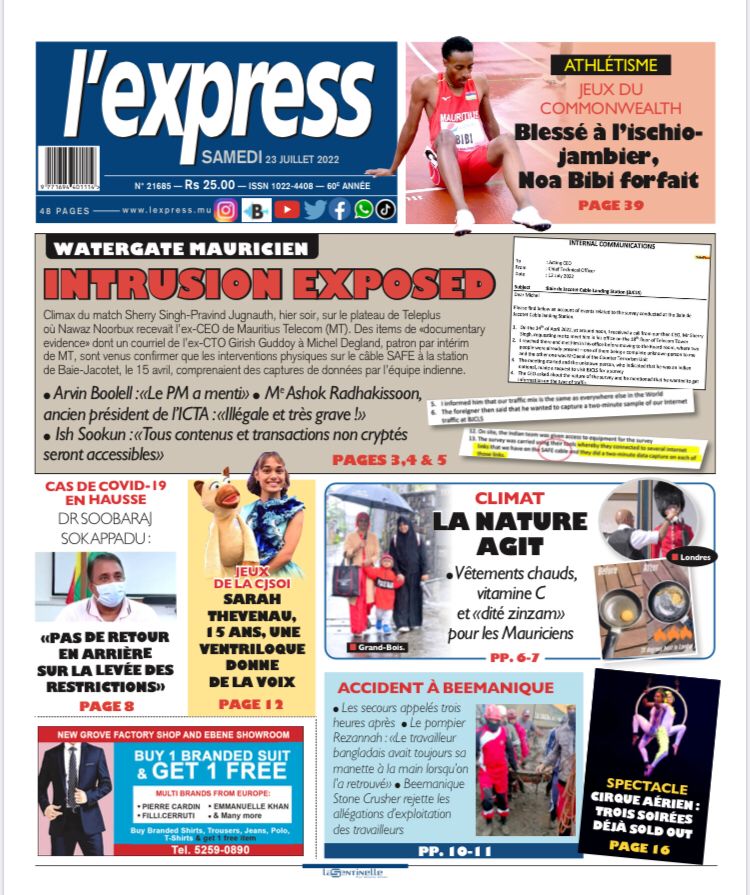 En une de l'express: Watergate Mauricien: Intrusion Exposed; Autre titre: Climat : la nature agit