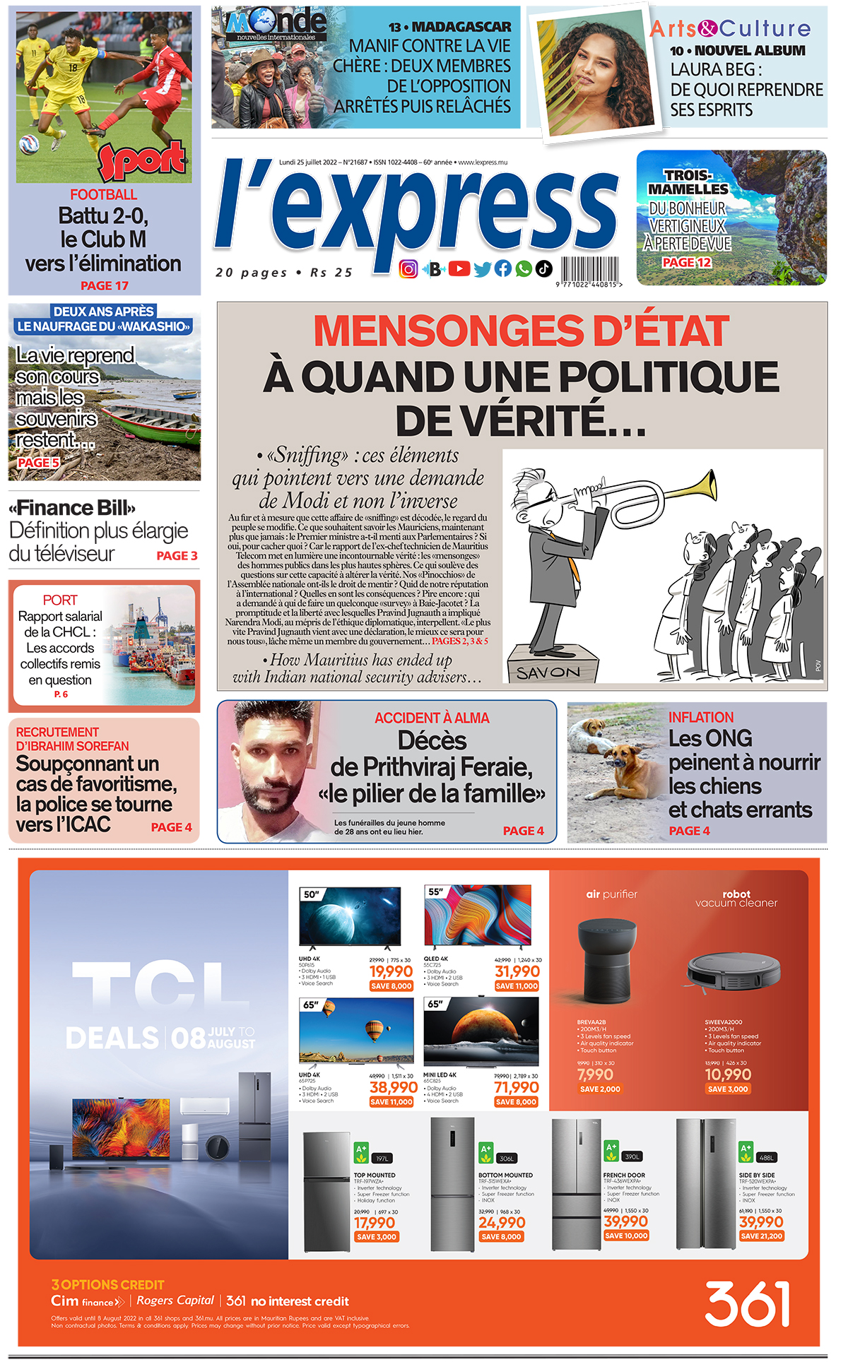 En une de l'express: Mensonges d’état : À quand une politique de vérité…; Autre titre: Inflation : Les ONG peinent à nourrir les chiens et chats errants.