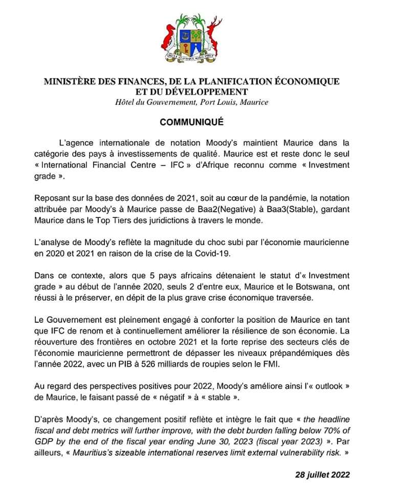 Maurice passe de Baa2 à Baa3. L'agence de notation Moody's a revu à la baisse la note de Maurice ce jeudi 28 juillet.
