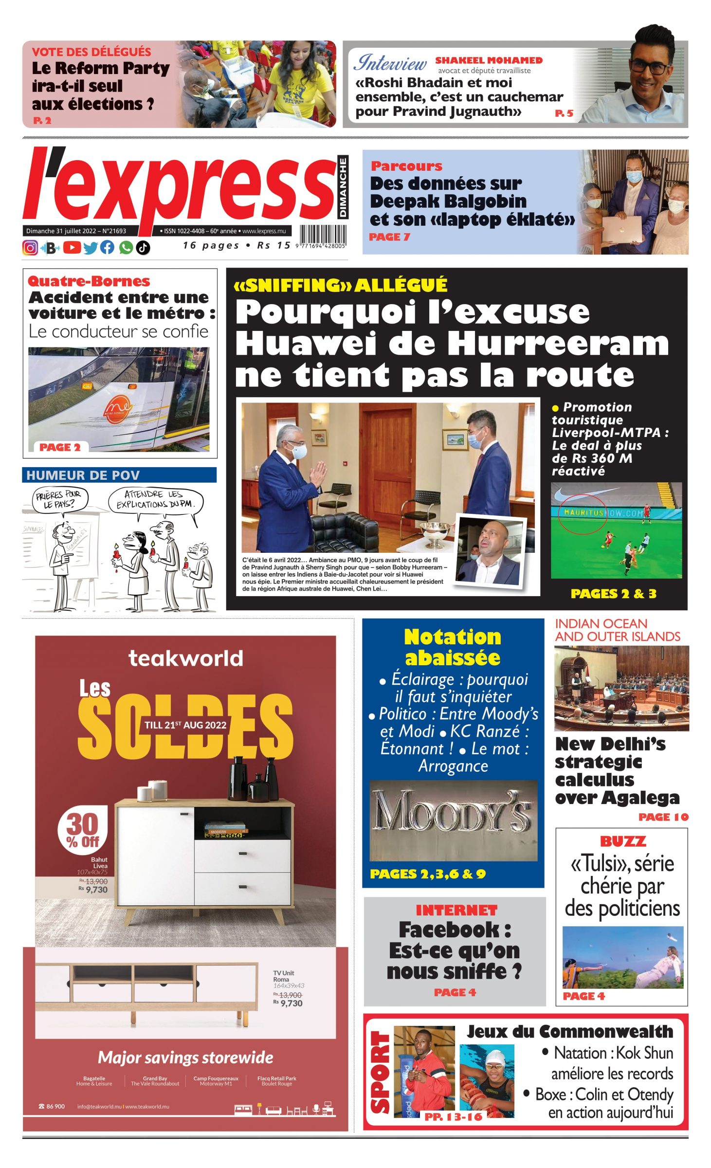 En une de l'express; «Sniffing» allégué: Pourquoi l’excuse Huawei de Hurreeram ne tient pas la route; Autre titre; Facebook : Est-ce qu’on nous sniffe ?