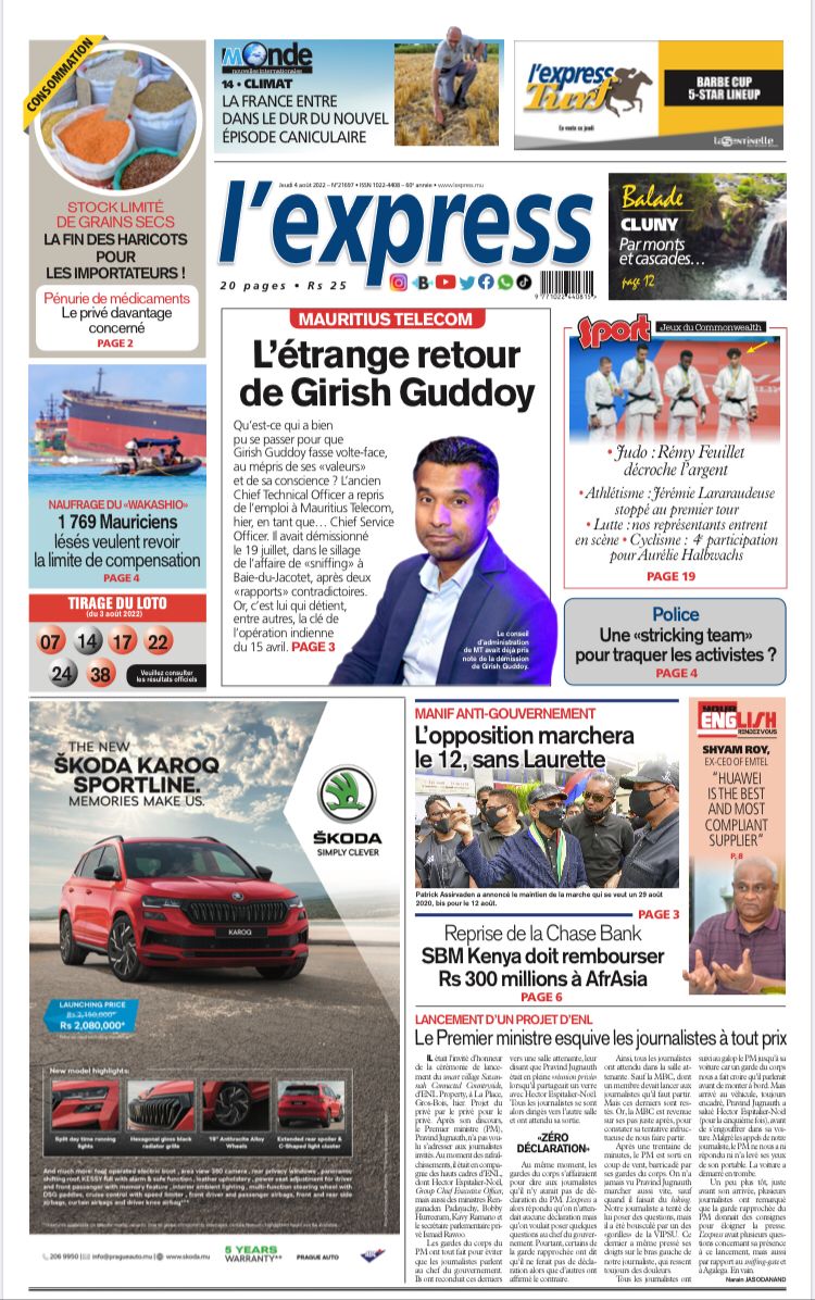 En une de l'express: Mauritius Telecom: L’étrange retour de Girish Guddoy ; Autre titre: Stock limité de grains secs: la fin des haricots pour les importateurs !