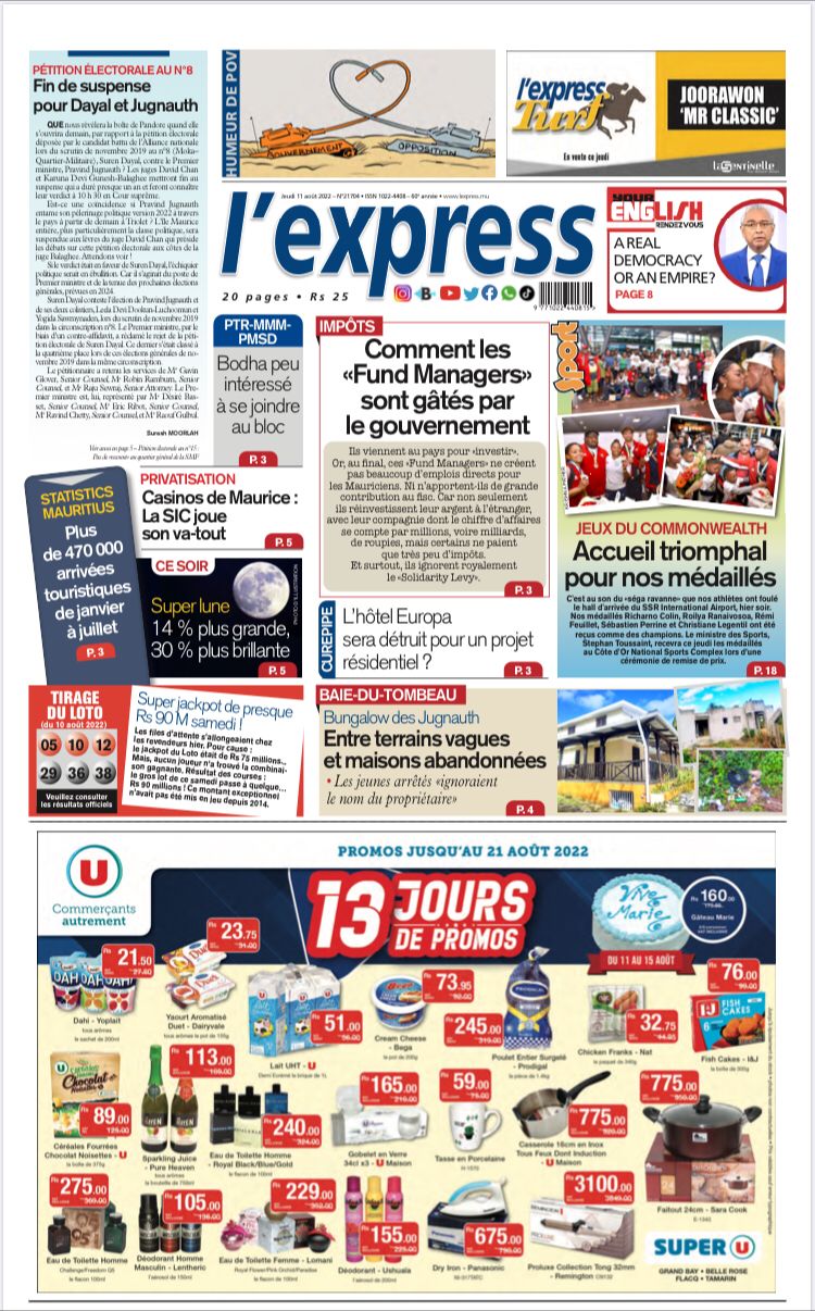En une de l'express: Impôts: Comment les «Fund Managers» sont gâtés par le gouvernement; Autre titre: Jeux Du Commonwealth: Accueil triomphal pour nos médaillés