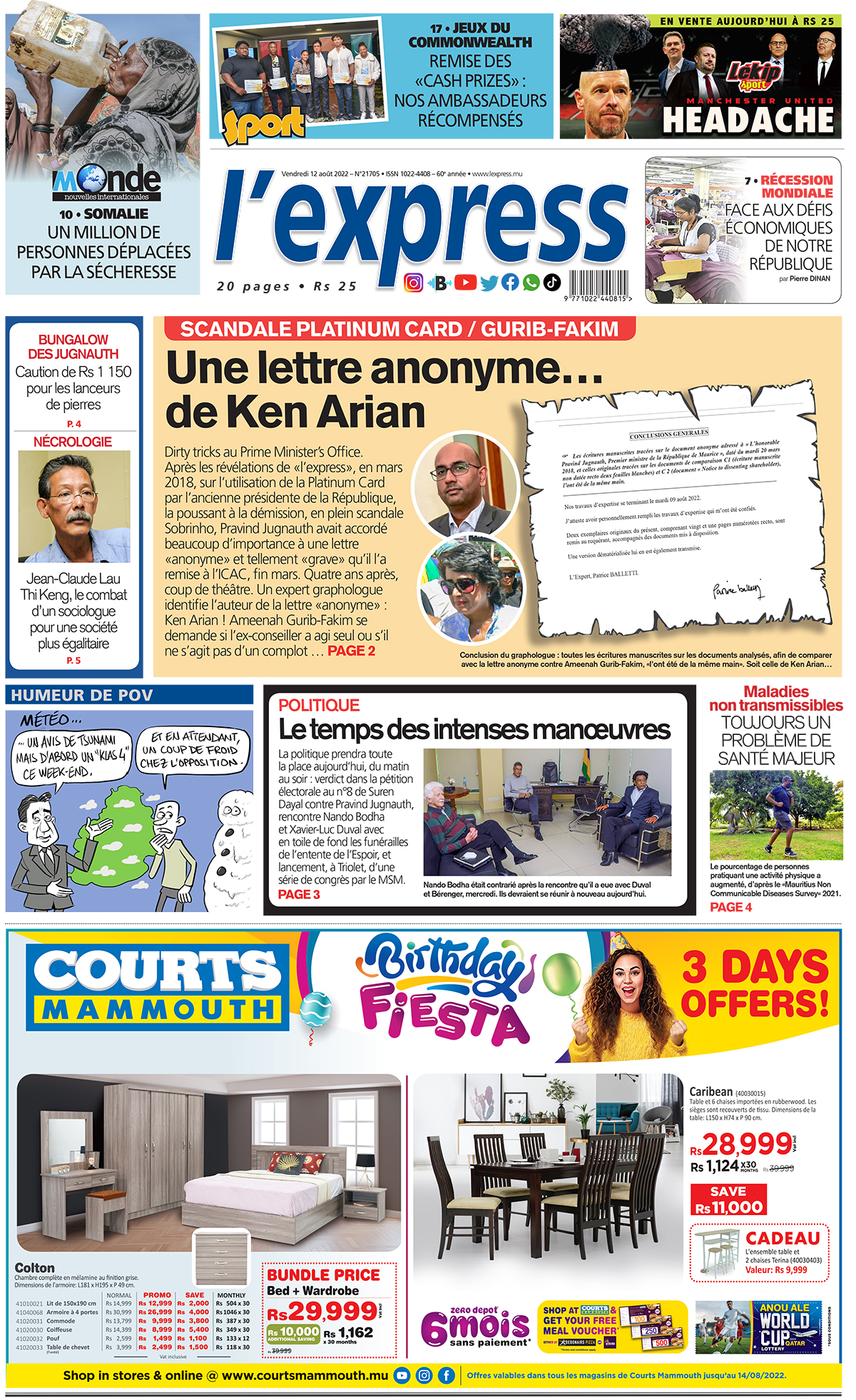 En une de l'express: Scandale Platinum Card /Gurib-Fakim : Une lettre anonyme… de Ken Arian; Autre titre: Politique : Le temps des intenses manœuvres.