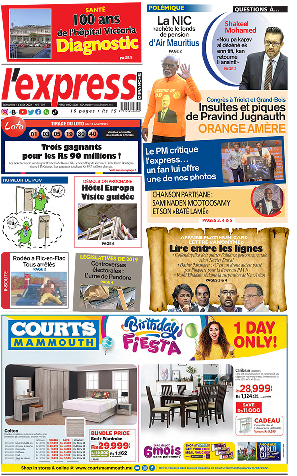 En une de l'express: Affaire Platinum Card - Lettre «Anonyme»: lire entre les lignes ; Autre titre: Congrès à Triolet et Grand-Bois: insultes et piques de Pravind Jugnauth