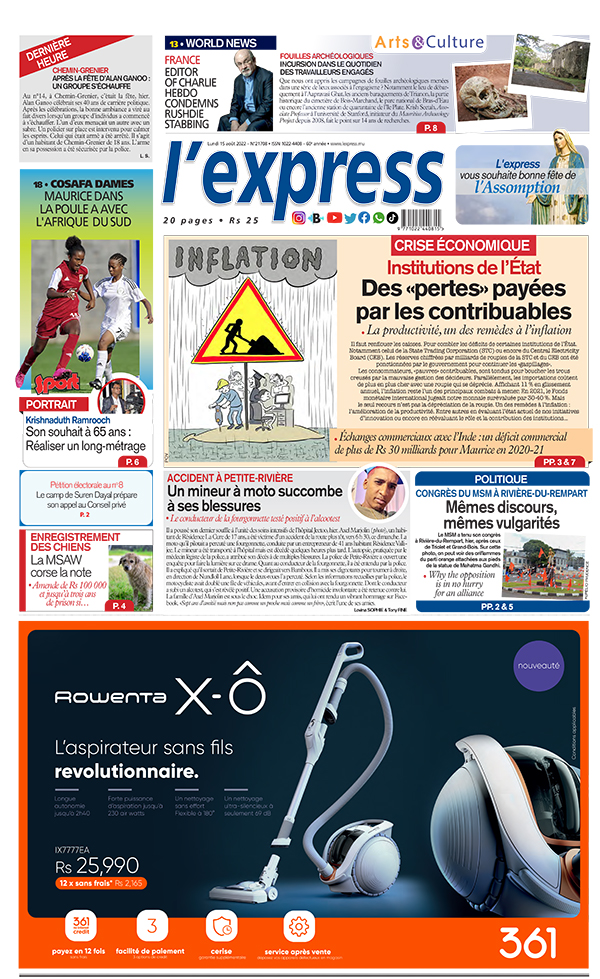 En une de l'express: Institutions de l’État: des «pertes» payées par les contribuables ; Autre titre: Congrès du MSM à Rivière-du-Rempart: mêmes discours, mêmes vulgarités