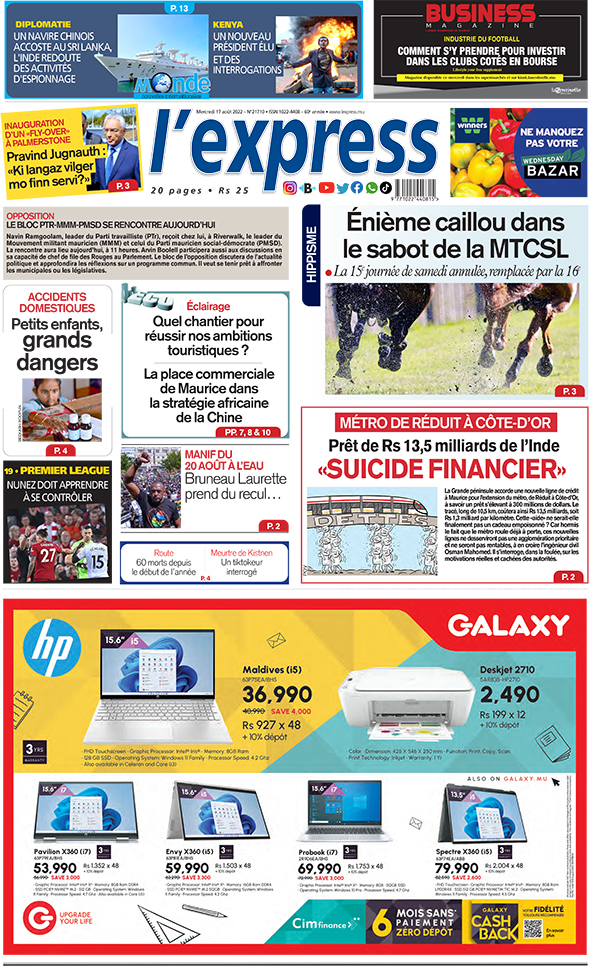 En une de l'express: Prêt de Rs 13,5 milliards de l’Inde: «Suicide financier» ; Autre titre: Opposition: le bloc PTr-MMM-PMSD se rencontre aujourd’hui