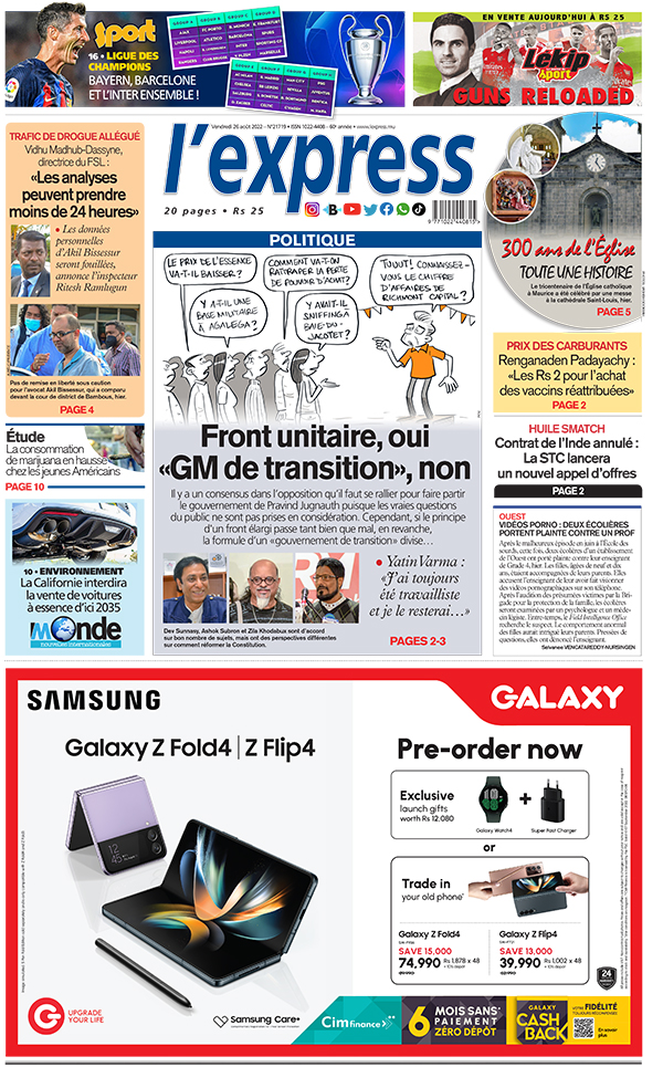 En une de l'express: Politique: Front unitaire, oui «GM de transition», non ; Autre titre: Yatin Varma: «J’ai toujours été travailliste et je le resterai…»