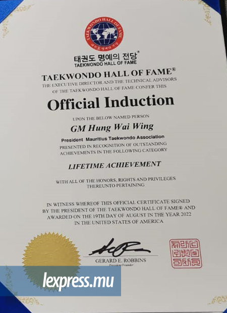 Pour rappel, c’est l’Américain Gerard Robbins, fondateur et président du ‘Taekwondo Hall of Fame’ qui avait fait part au Mauricien de sa nomination en 2021. « Il est temps pour vous de prendre votre place dans l'histoire du taekwondo. Nous sommes heureux d'inclure votre biographie dans la section relative aux leaders dans le domaine du taekwondo. De plus, en tant que pionnier de cette discipline à l'île Maurice, vos réalisations ont été examinées pour que vous receviez ‘un award’ lors de la prochaine cérémonie officielle de la ‘World Taekwondo Hall of Fame’ en tant que ‘père du taekwondo à l'île Maurice ‘ » avait déclaré Gerard Robbins au Grand Maître Mario Hung Wai Wing dans une correspondance.