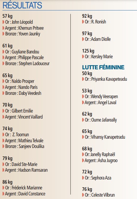 En lutte féminine, Jenelly Raphaël disputait sa première compétition au niveau national, hier. Agée de 17 ans, elle a remporté son unique combat contre Asha Jugroo. «J’ai signé une belle victoire et je suis très fière de ma performance», lance la lutteuse de Rodrigues. Après ce titre national, elle rêve des Jeux des îles et des Jeux de la Francophonie. «Cela fait cinq ans que je pratique la lutte. Mon objectif pour 2023 est de décrocher une médaille d’or aux Jeux des îles. J’espère aussi avoir l’opportunité de faire des compétitions de niveau mondial comme les Jeux de la Francophonie», confie-t-elle. Un total de 46 lutteurs ont participé aux championnats de Maurice juniors et seniors. Les huit régions représentées sont Rodrigues, Quatre-Bornes, Rose-Hill, Vacoas, Curepipe, Savanne, PortLouis et Rivière-du-Rempart.